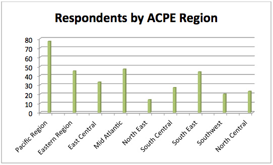Figure 2 shows the responses by geographic location. I used the geographical divisions from the ACPE. This allowed a grouping by states (but note that Pennsylvania is divided between two regions: those locations nearer to Philadelphia went into the Eastern Region while locations nearer to Pittsburg went into the East Central Region.)