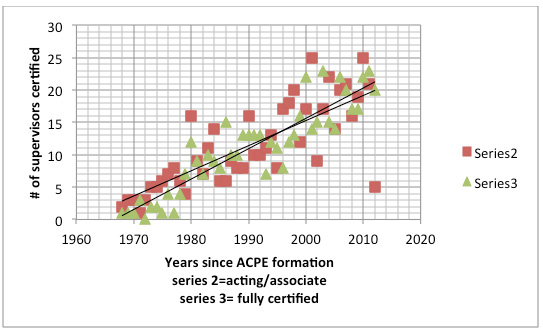 In light of the turn of events, I became interested in collecting data on the numbers of certifications and available positions. First, I contacted the ACPE national office for the numbers of persons certified by year and the gap between those certified as Associate or "acting" and then those fully certified. I received raw data on this in late February 2014 (noted in Figure 4, below), which demonstrated that the ACPE increased the numbers of certified supervisors steadily from 1968 through 2012 (the date of the most current data available).
